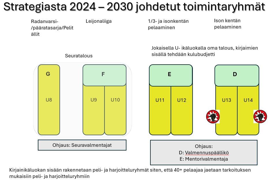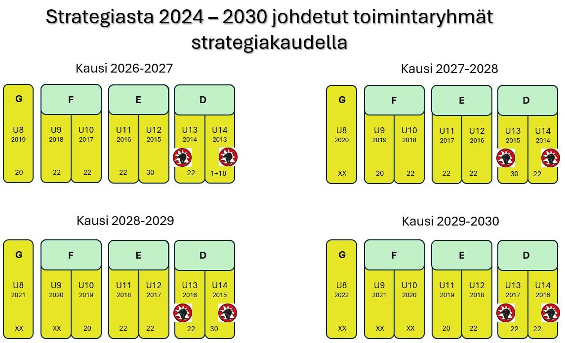 Pelaajat toimivat syntymävuotensa mukaisissa kirjainikäluokissa esim. kaudella 2026–2027, 2016 ja 2015 vuonna syntyneet toimivat (harjoittelevat ja pelaavat) E- ikäluokassa. Kun pelaaja on kirjainikäluokan nuorempi, on hänellä mahdollisuus oppia vanhemmilta pelaajilta ja olleessaan vanhempi toimii hän esimerkkinä nuoremmille.